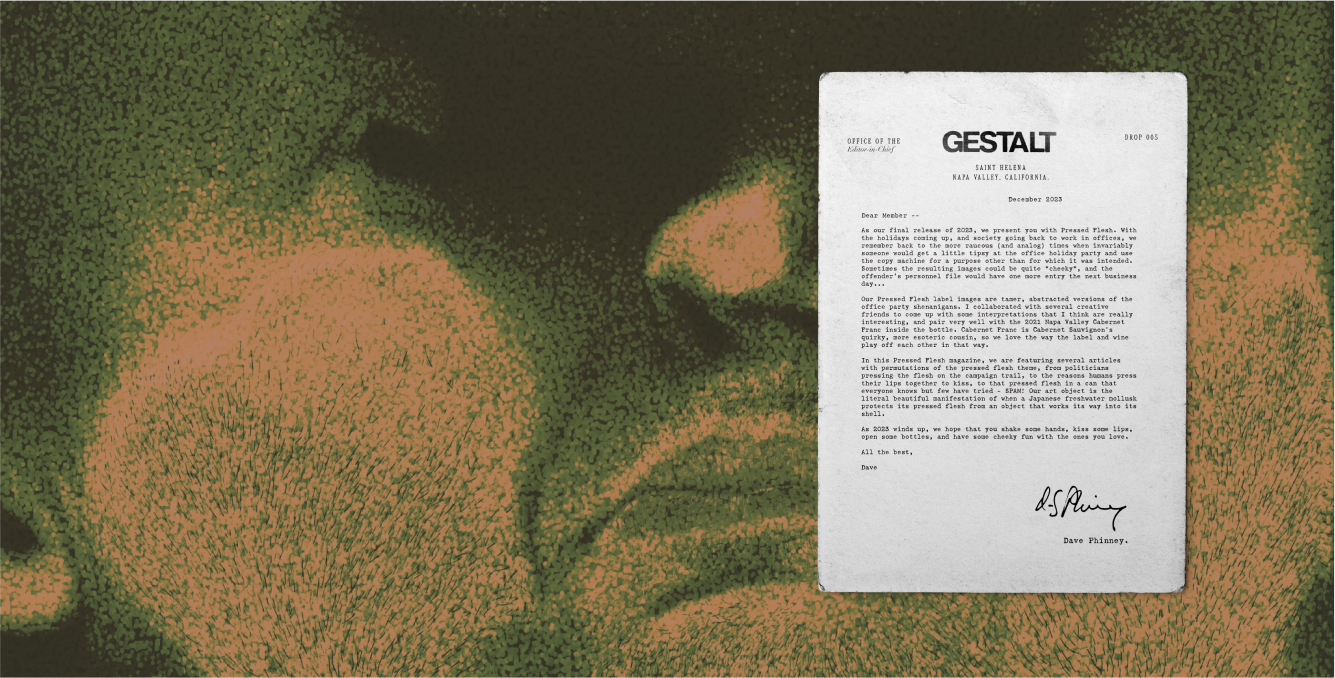 Our Pressed Flesh label images are tamer, abstracted versions of the office party shenanigans. Dave collaborated with several creative friends to come up with some interpretations of our theme that pair very well with the 2021 Napa Valley Cabernet Franc inside the bottle. Cabernet Franc is Cabernet Sauvignon’s quirky, more esoteric cousin, so we love the way the label and wine play off each other.